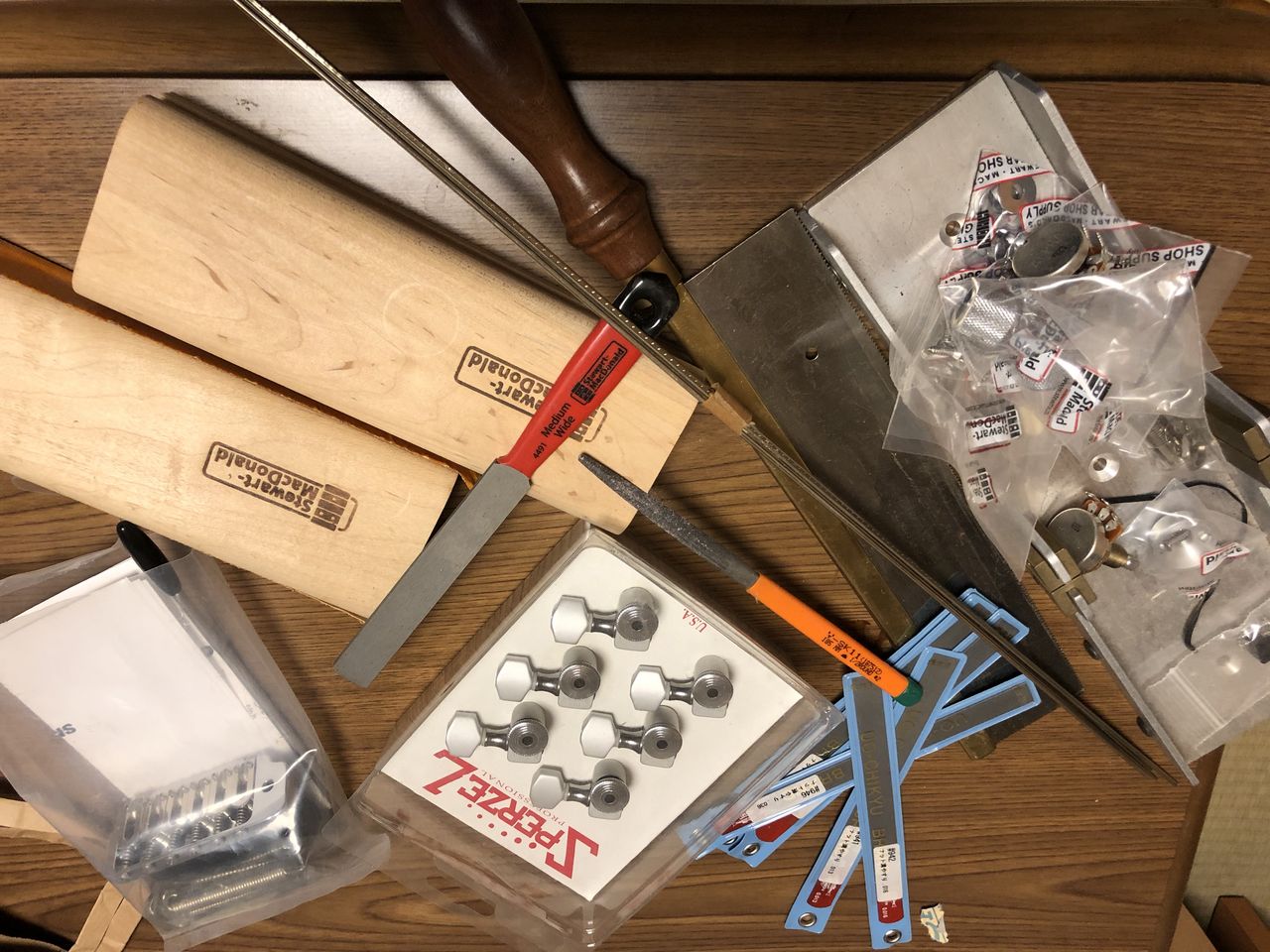 丸ノコや、トリマーなどの電動工具はamazonで購入。木材はアイチ木材加工、パーツや専用工具はStewartMacDonaldで購入。 そして、製作手順は、、、