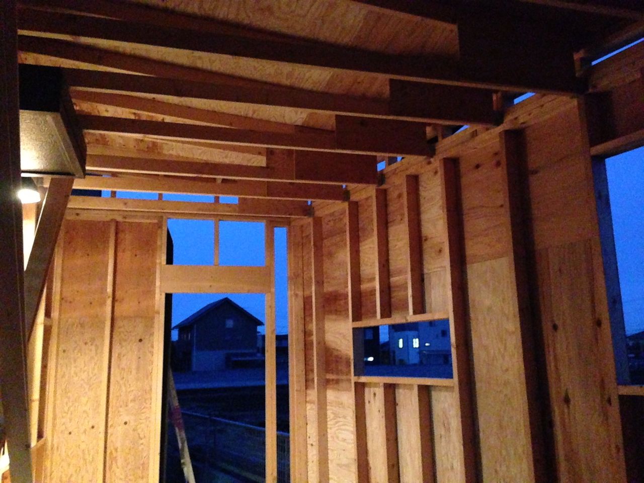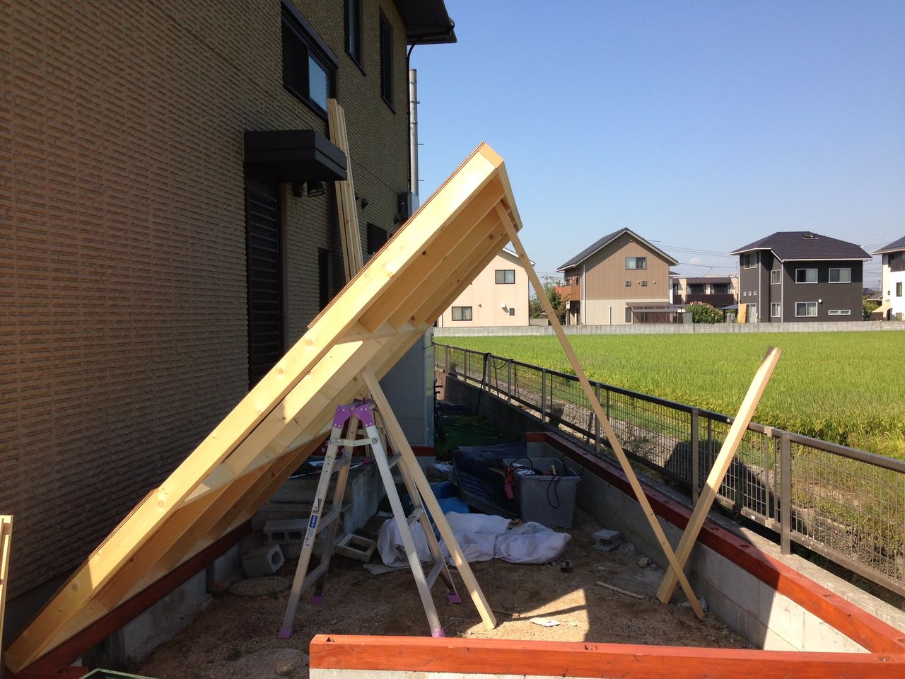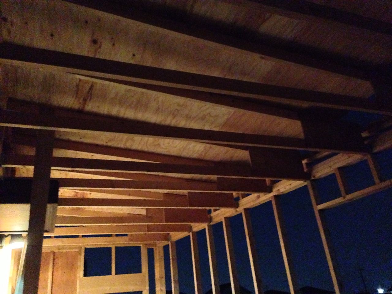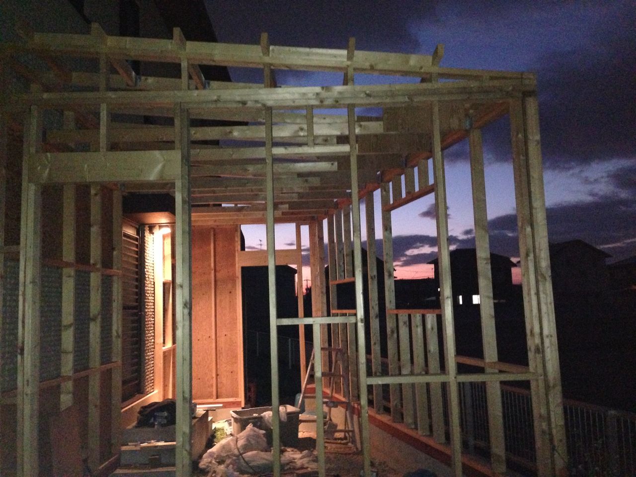 その後、垂木に直行して垂木同士をつなぐ木材 (名称は判りません) を取り付けると、だいぶ強度が上がってきました。