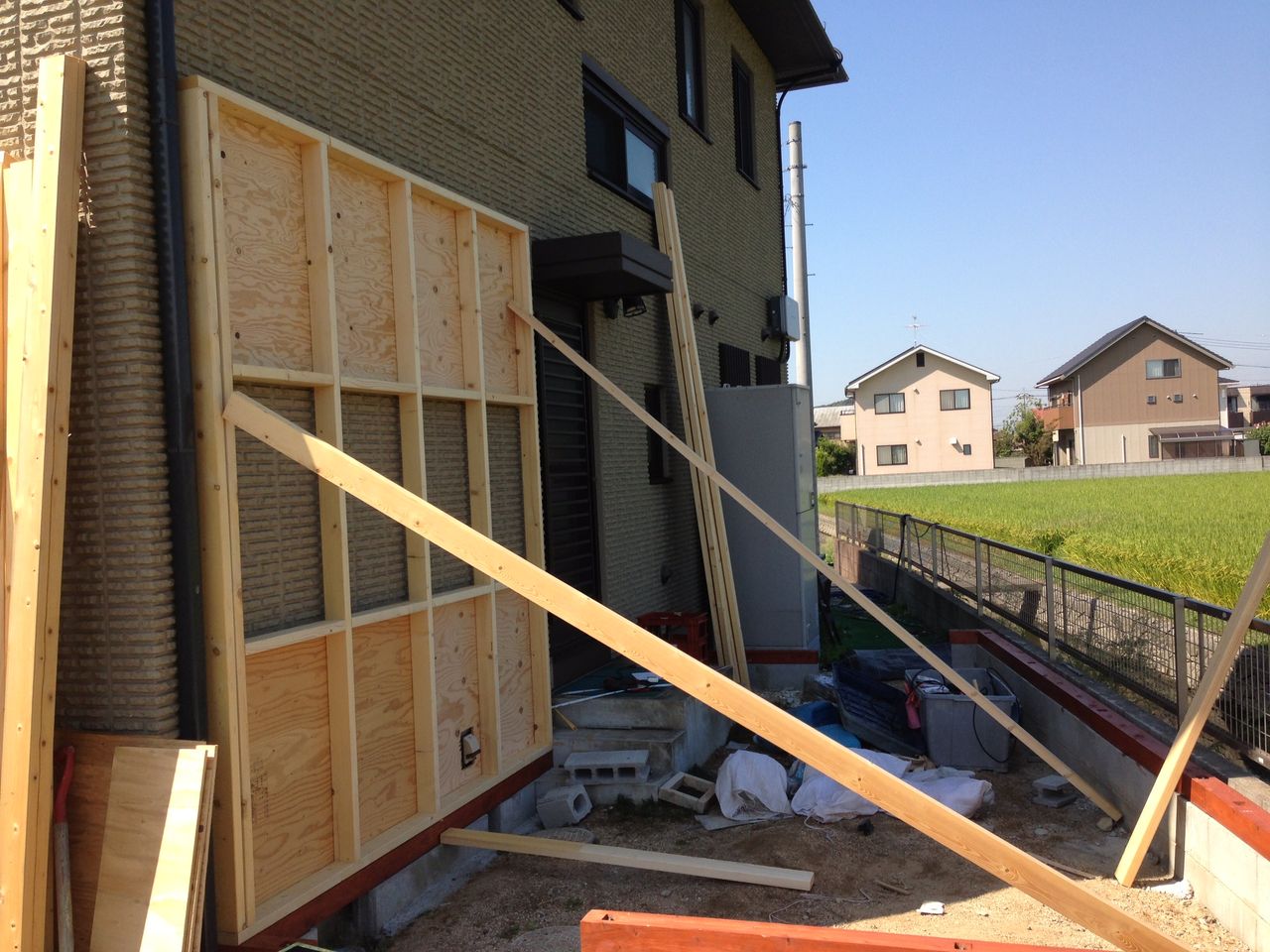 何度かトライしてみましたが、合板が重いしデカすぎて風に煽られるしで無理でした。また大きさ的に、前回のような窓からの搬入も無理です。