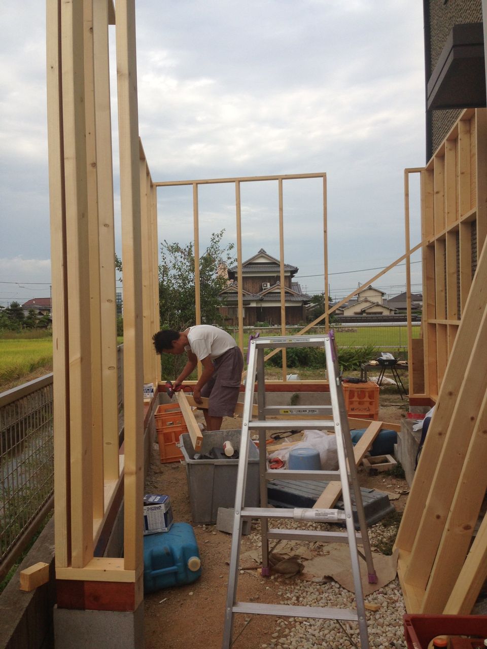 まずは、設計図通りの長さで枠組みを作ります。柱の間隔は強度を考え450ミリ以内におさめます。