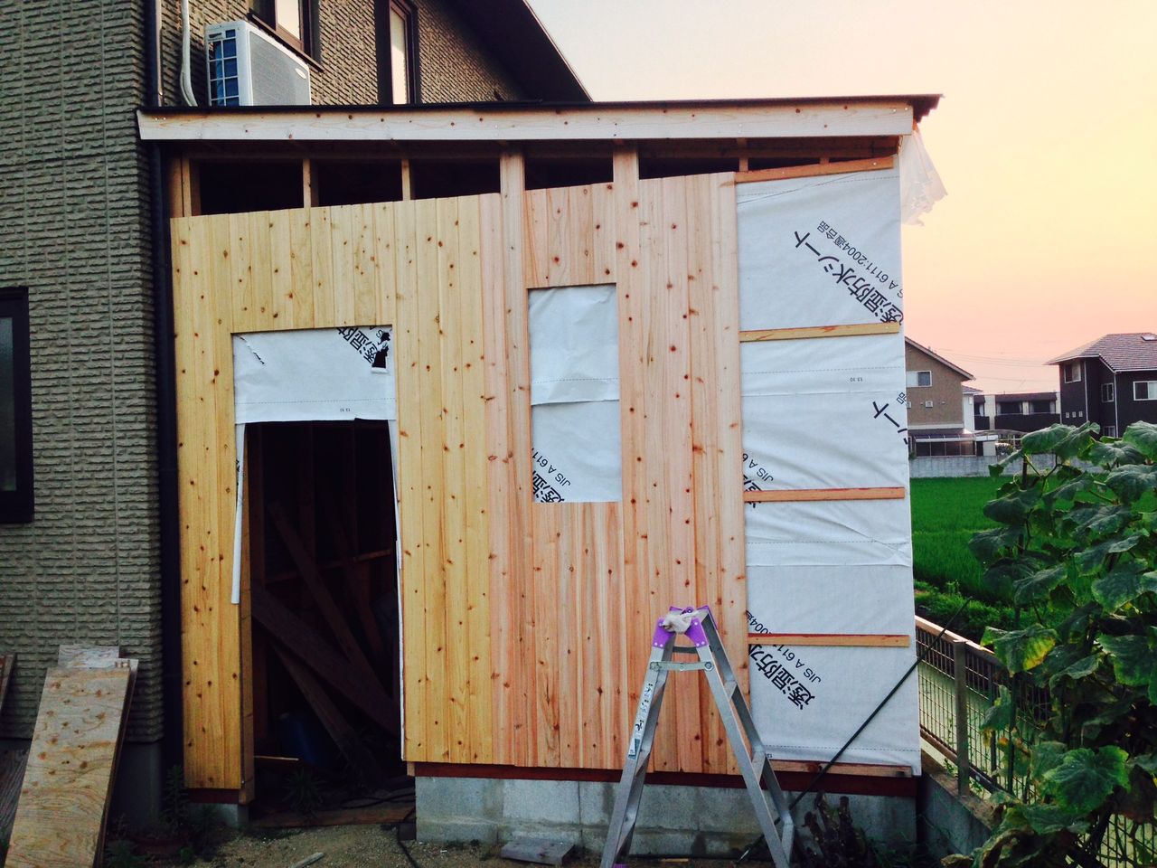 外壁の杉板を貼ったのは写ってるごく一部分だけで、残りの面は防水紙を貼ったまま放置\( ˆoˆ )/